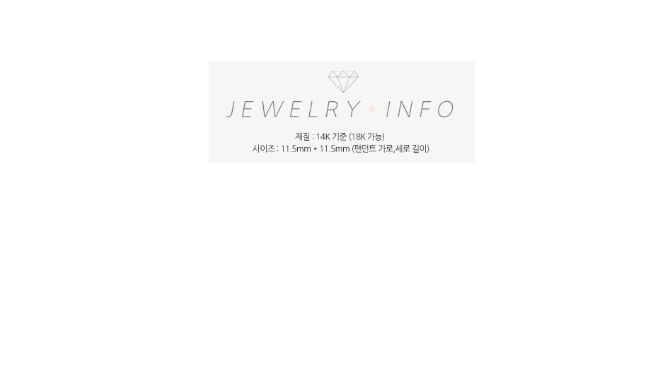 ♣ 팬던트와 줄 포함 금액이랍니다^^ 중량 : 약 1.5g 재질 : 14k 골드 정품 (18k 제작 가능해요~^^) 색상 : 옐로우, 화이트, 핑크 골드 스톤 : 정품 큐빅 지르코니아 팬던트 크기 : 가로 11.5mm * 세로 11.5mm 줄 길이 : 기본 40cm 또는 42cm 입니다. 보통은 기본 길이로 주문하신답니다. 원하시는 길이 있으시면 주문시 메모란에 적어주세요~ 맞춰서 제작해드리겠습니다 ^^